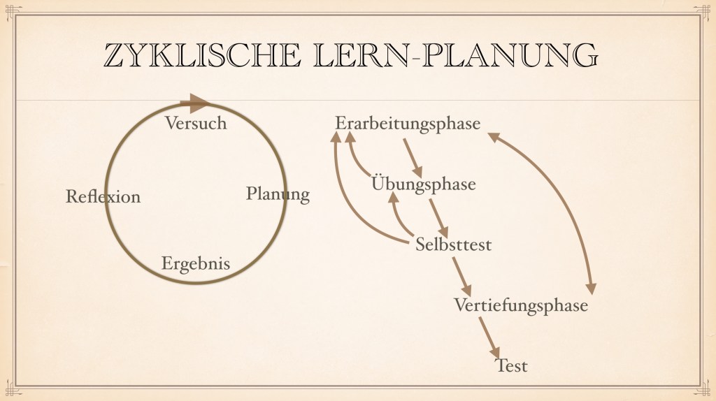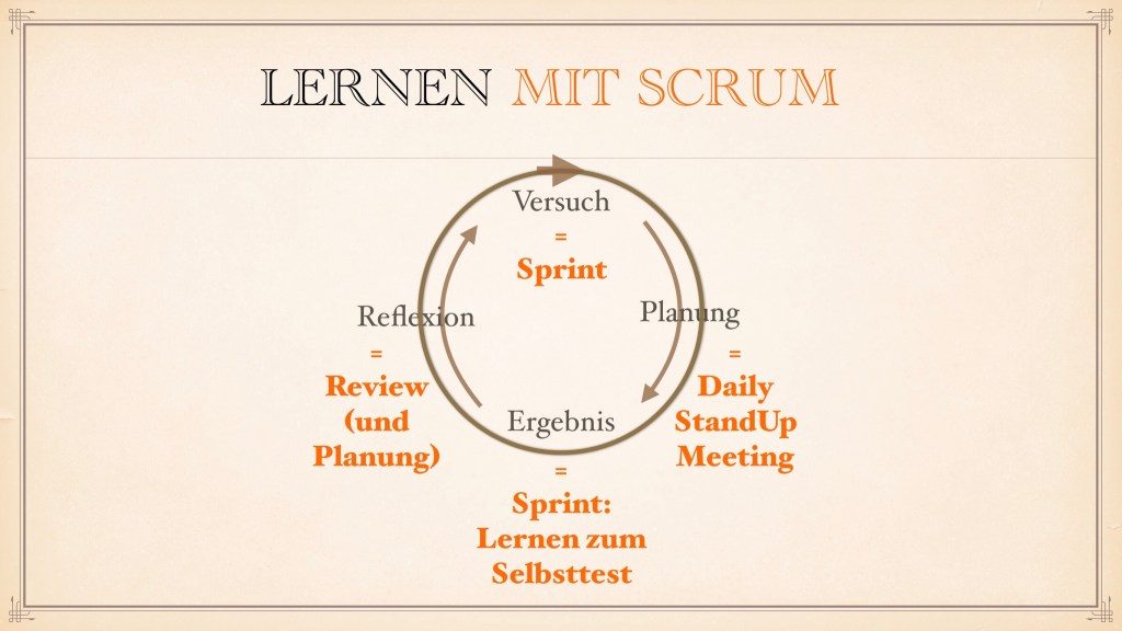 In Scrum sind Schüler:innen aufgefordert, sich vor jedem Sprint (bei mir im Regelfall eine Doppelstunde, bei ungerader Wochenstundenzahl eher drei Stunden) einen Plan zurechtzulegen, den sie dann (nach Möglichkeit) umsetzen. Anschließend reflektieren sie die Umsetzung des Plans und erwägen Konsequenzen für den nächsten Sprint. Eine mögliche Planungsdimension kann dabei die Lernphasierung sein: Neuer Stoff wird zunächst erarbeitet, dann geübt und schließlich getestet; wenn Zeit ist, kann das Thema vertieft und erneut getestet werden (auch das habe ich meinen Schüler:innen im gleichen Video erklärt).