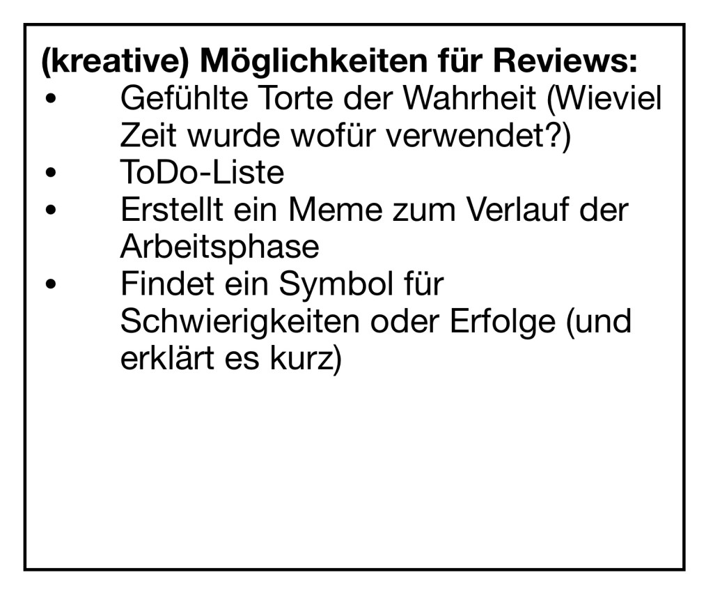 Bei Reviews haben wir anfangs mit kurzen schriftlichen Texten gearbeitet. Mittlerweile habe ich das geöffnet, um den Teams mehr Freiheiten zu geben. Mit Memes, einer gefühlten Torte der Wahrheit oder einem Symbol können Lernende ihre Wahrnehmung oft viel besser auf den Punkt bringen. So erweitert sich die Ausdruckweise und wir öffnen andere Zugänge zu Reflektionsmöglichkeiten für Schüler:innen, denen das geschliffene Wort nicht so liegt.