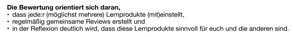 Letztlich bewerte ich vordergründig Häufigkeit und Inhalt von Lernprodukten und Reviews, um Aktivität und Meta-Lernen einzufordern, im Hintergrund läuft die Qualitätensuche im Zusammenspiel von Lernprodukten, Reviews und abschließender Reflexion.