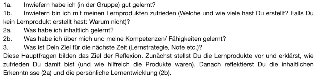 Die Idee hinter der Reflexion (pdf oder doc [Update 18.3.22 auf neues pdf und doc]) ist damit eine Produkt-Portfolioarbeit: Die Lernenden halten Rückschau auf ihre Lernprodukte und auf ihre Reviews. Auch hier spiegelt sich das Spannungsfeld zwischen individuellem und gemeinsamem Lernprozess. Daher habe ich mittlerweile freigestellt, ob die Reflektion individuell oder als Gruppe erstellt wird. Wichtig ist, dass jede:r individuell zu Wort kommt – allerdings muss natürlich ein Reflektionsgespräch im Team der Verschriftlichung vorausgehen. Daher stehen im Handout viele Fragen, die wichtig sein können.