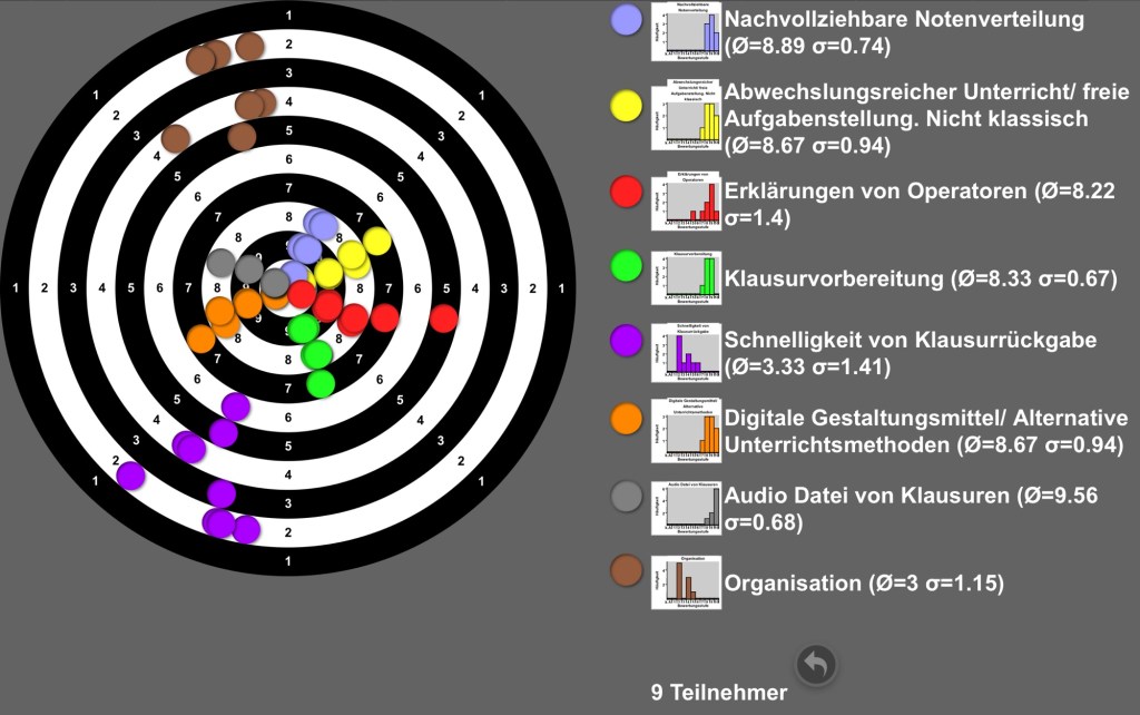 Für mich hat dieses Vorgehen mehrere Vorteile. Zunächst ist das neben der Transparenz in meinem Vorgehen das Reden über Unterricht. Lernende müssen in der Diskussion über die Formulierung von Items ihre Perspektive auf meinen Unterricht in Worte fassen. So kommen sie gemeinsam ins Gespräch und Reflexionskategorien werden ebenso sagbar wie Qualitätsmerkmale. Bisweilen zeigen die Zielscheibe (und die Sigma-Werte) durchaus divergierende Einschätzungen: Was einige Lernende schätzen, missfällt anderen. Dadurch bringe ich meine Lernenden bereits auf die Meta-Ebene, die Diskussion über Lernen und Unterricht.