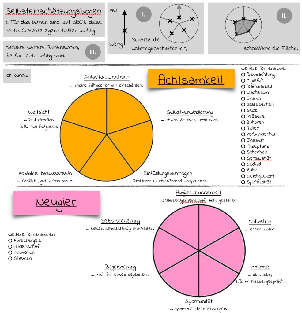 Anhand dieser Selbstreflexionsbögen können die Schüler:innen einschätzen, wie ausgeprägt eine diese Fähigkeiten und Charaktereigenschaften bei sich selbst sind.